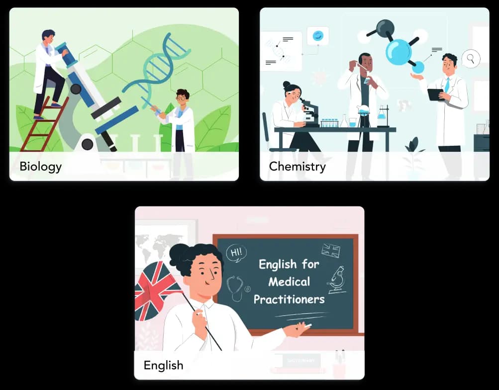 Study 3 subjects in our online course: Biology, Chemistry, Medical English and use our large question bank and different methods to practice questions for optimal & fun preparation